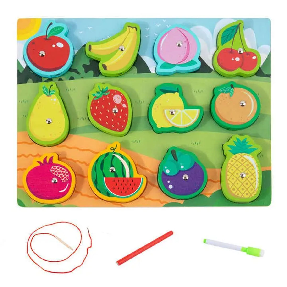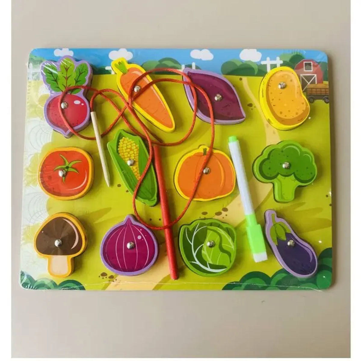 تمكّن الطفل من إدخال الخيط داخل القطع أو التقاطها، مما يعزز التركيز والتنسيق الحركي، بالإضافة إلى التعرف على أشكال وأسماء الخضر