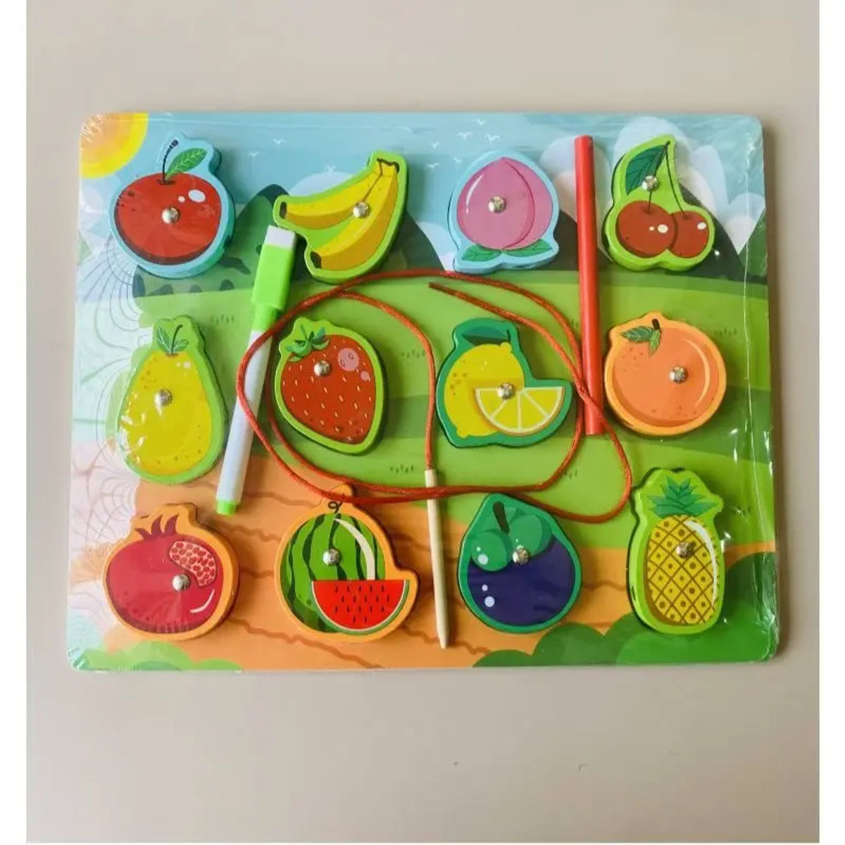 تمكّن الطفل من إدخال الخيط داخل القطع أو التقاطها، مما يعزز التركيز والتنسيق الحركي، بالإضافة إلى التعرف على أشكال وأسماء الفواكه بطريقة ممتعة.