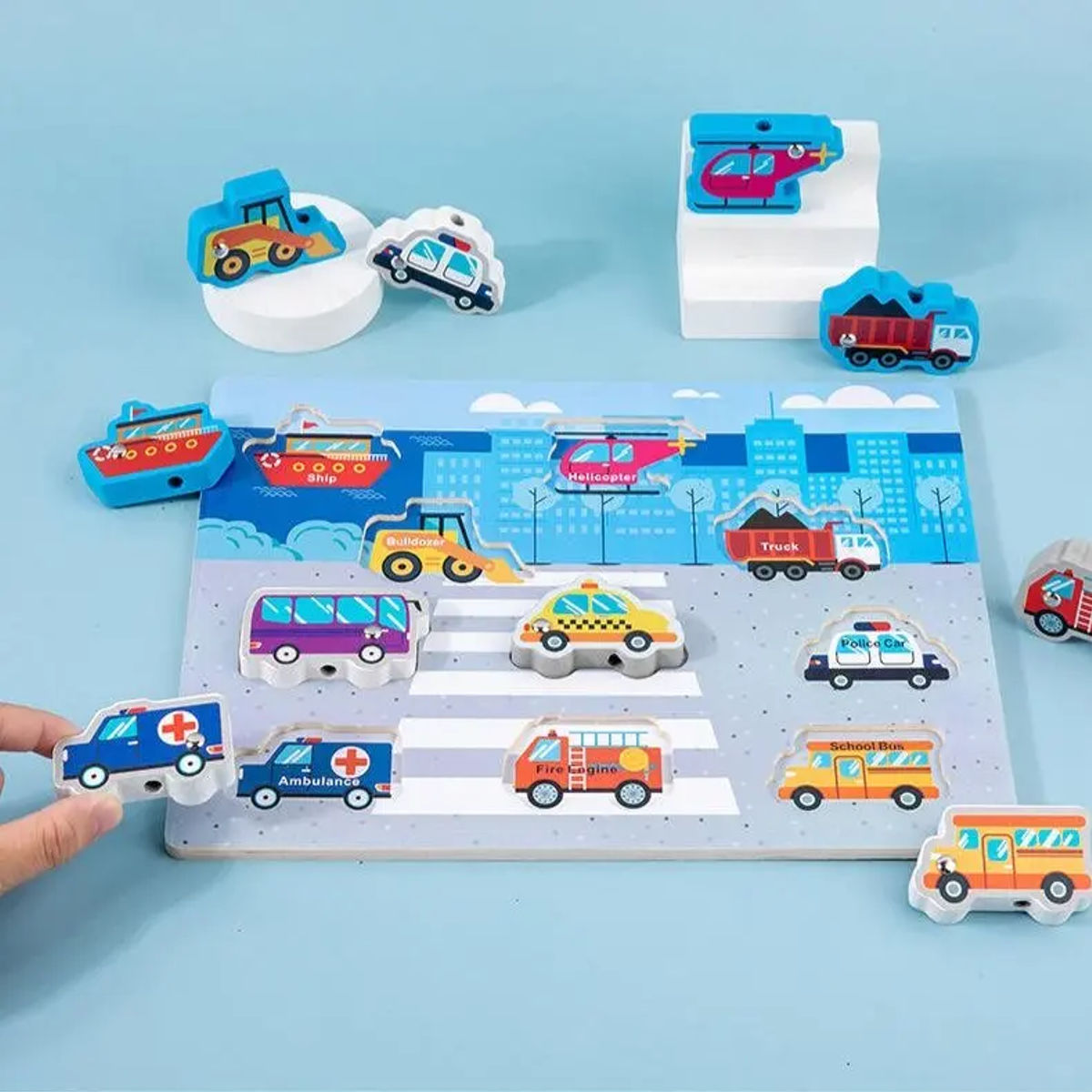 تصميم تفاعلي: تحتوي على قطع خشبية سميكة وسهلة الإمساك (3D) تمثل سيارة الإسعاف، الإطفاء، الحافلة المدرسية، السفينة، وحتى الهليكوبتر!