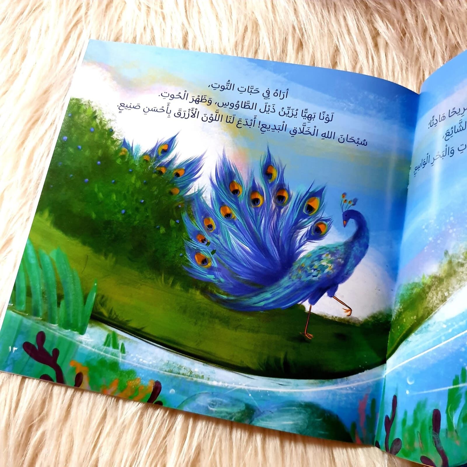 الَّذِي خَلَقَ لَنَا الْكَوْنَ بِلَا مِثَالٍ سَابِقٍ، وَتُعَدِّدُ لَهُمْ أَلْوَانَ بَعْضِ الْمَخْلُوقَاتِ لِتُعَرِّفَهُمْ عَلَيْهَا فِي بِنَاءٍ سَرْدِيٌّ مُمْتِعٍ