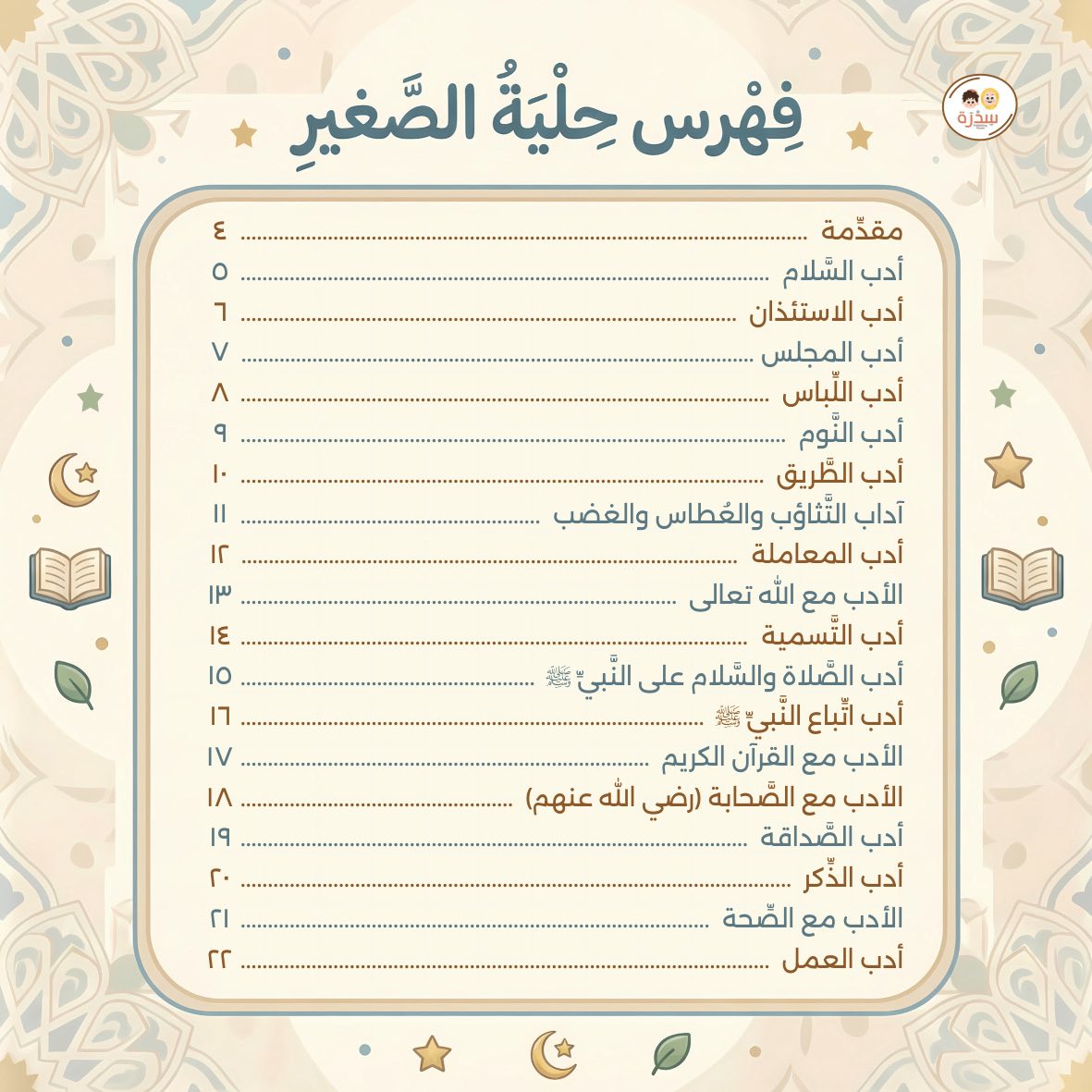 كتاب “حِلْيَة الصغير” – دليلكِ العملي لغرس أخلاق الإسلام! كتاب بسيط ومركز يجمع لأسرتكِ 39 أدباً إسلامياً بأسلوب رصين وسهل. من آداب التعامل مع الوالدين إلى آداب المسجد والطعام، يمنح هذا الكتاب (44 صفحة) طفلكِ الأدوات اللازمة لبناء شخصية خلوقة ومتزنة، وهو مناسب جداً للمنازل والمؤسسات التعليمية.