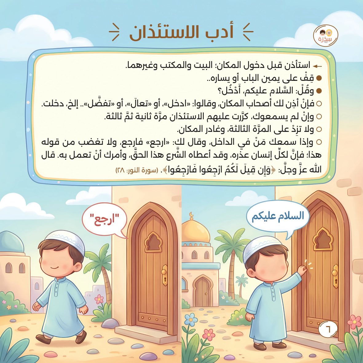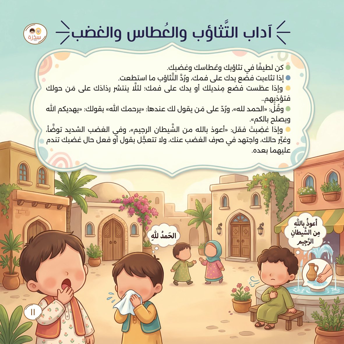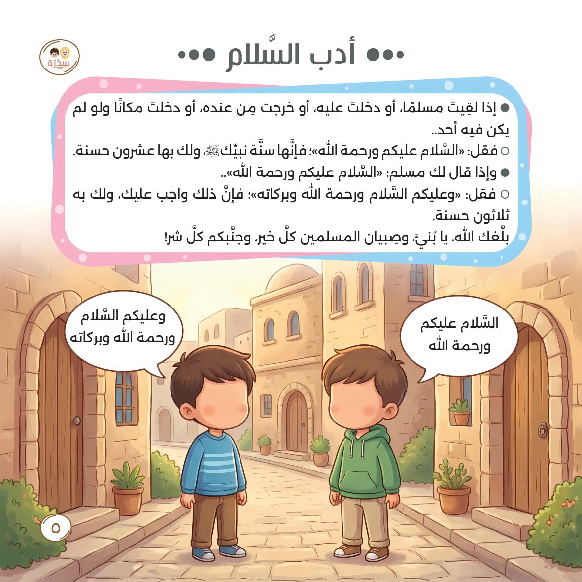 سلوكيات يومية: يغطي آداب الأكل والشرب، السلام، الاستئذان، والتعامل مع المسجد والذكر، مما يبني أخلاقاً ثابتة منذ الصغر،